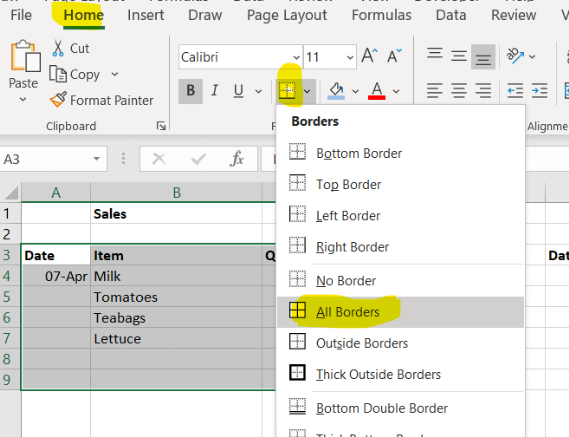 - Go to the home ribbon, select the border tool
