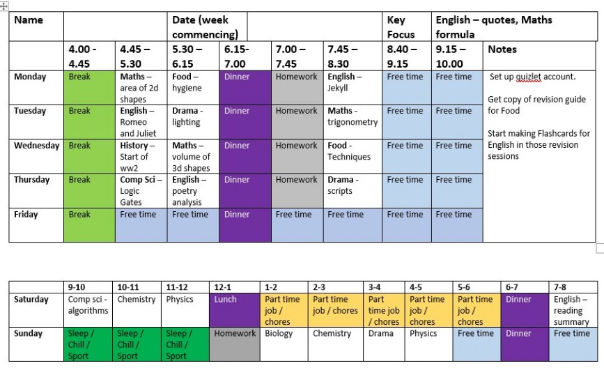 A timetable lets you organise your time so you get the most out of it. I would recommend using a 2 week timetable and re drawing it every two weeks so you know exactly where you are.