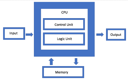 The first image (blue one) shows the basic architecture. The second has ignored the input and output section and zoomed in on the middle section - the CPU and Memory bit.